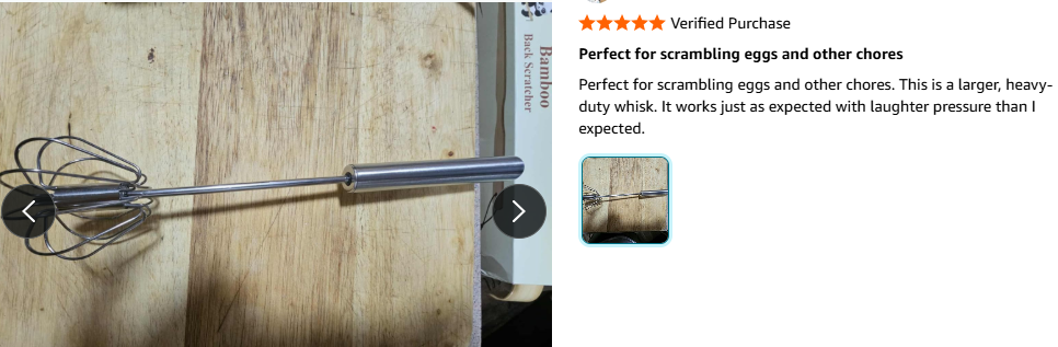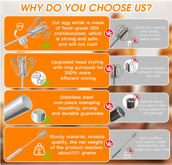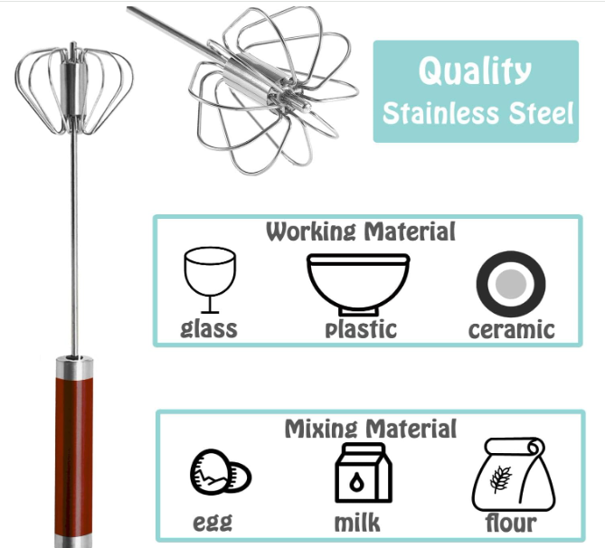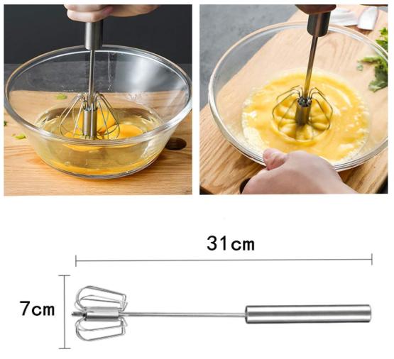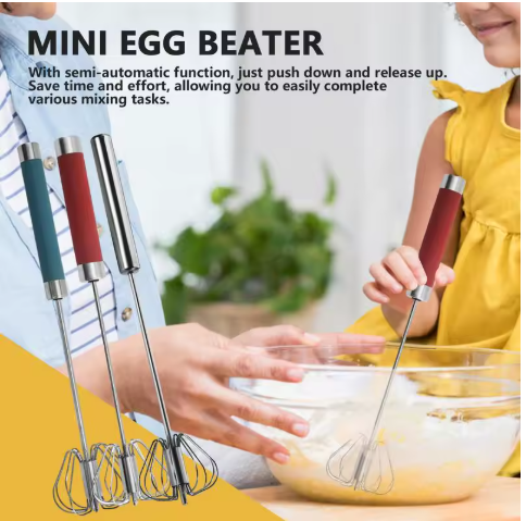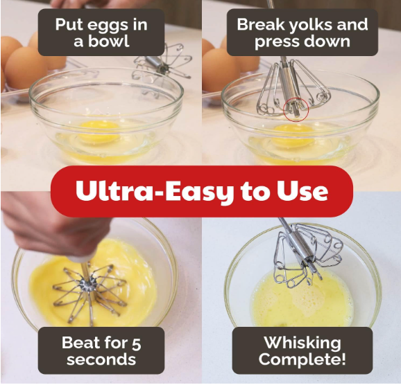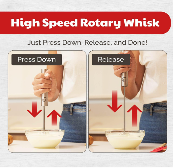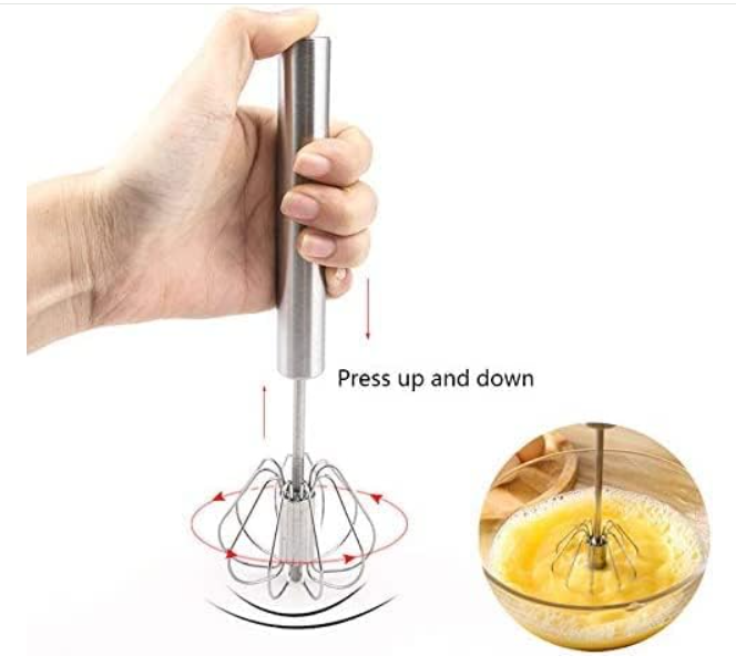 Simply press down on the handle, and the whisk spins automatically with each push! The spring mechanism does the hard work for you—mixing eggs, cream, or batter faster and easier than a traditional whisk. Perfect for both cooking and baking.